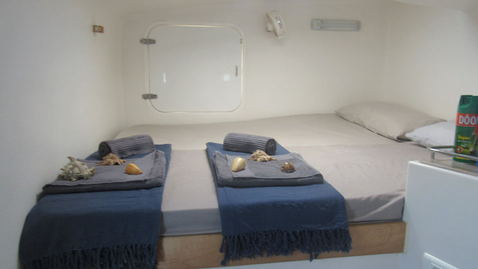 She can accommodate a maximum of 15 day guests or 6 overnight guests. There are 2 separate bathrooms with electric flush toilet, wash basin & shower with pressurised hot & cold water. There is also a deck shower for rinsing off after swimming in the sea!